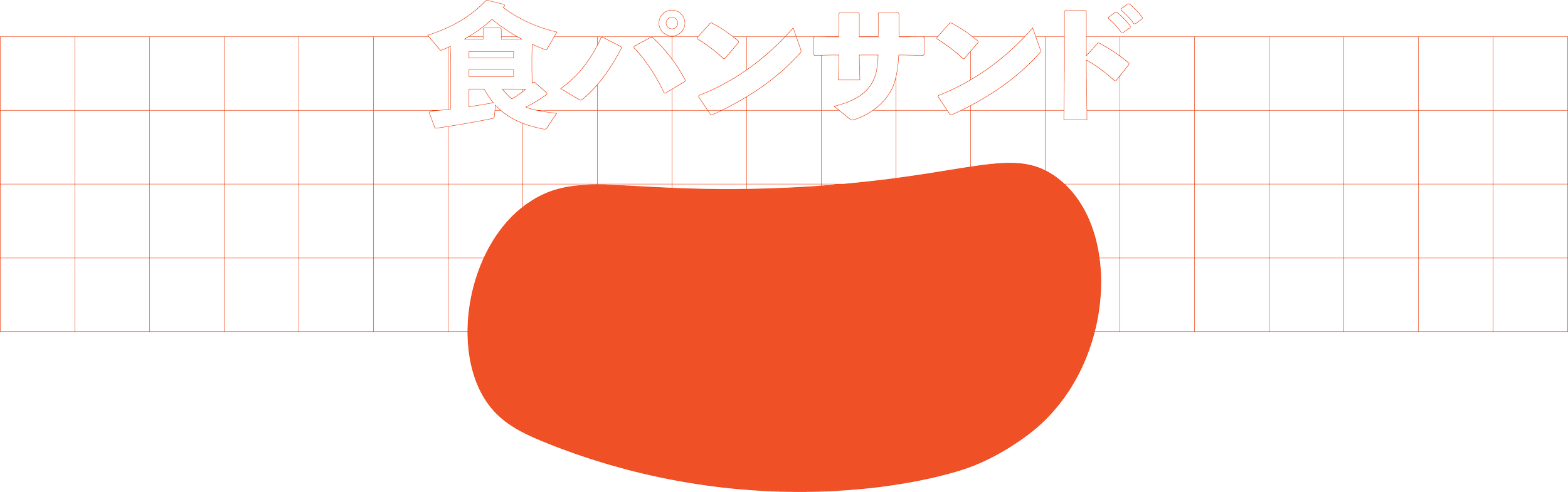 Image of Japanese text and a large orange-red bean shape on a grid background.